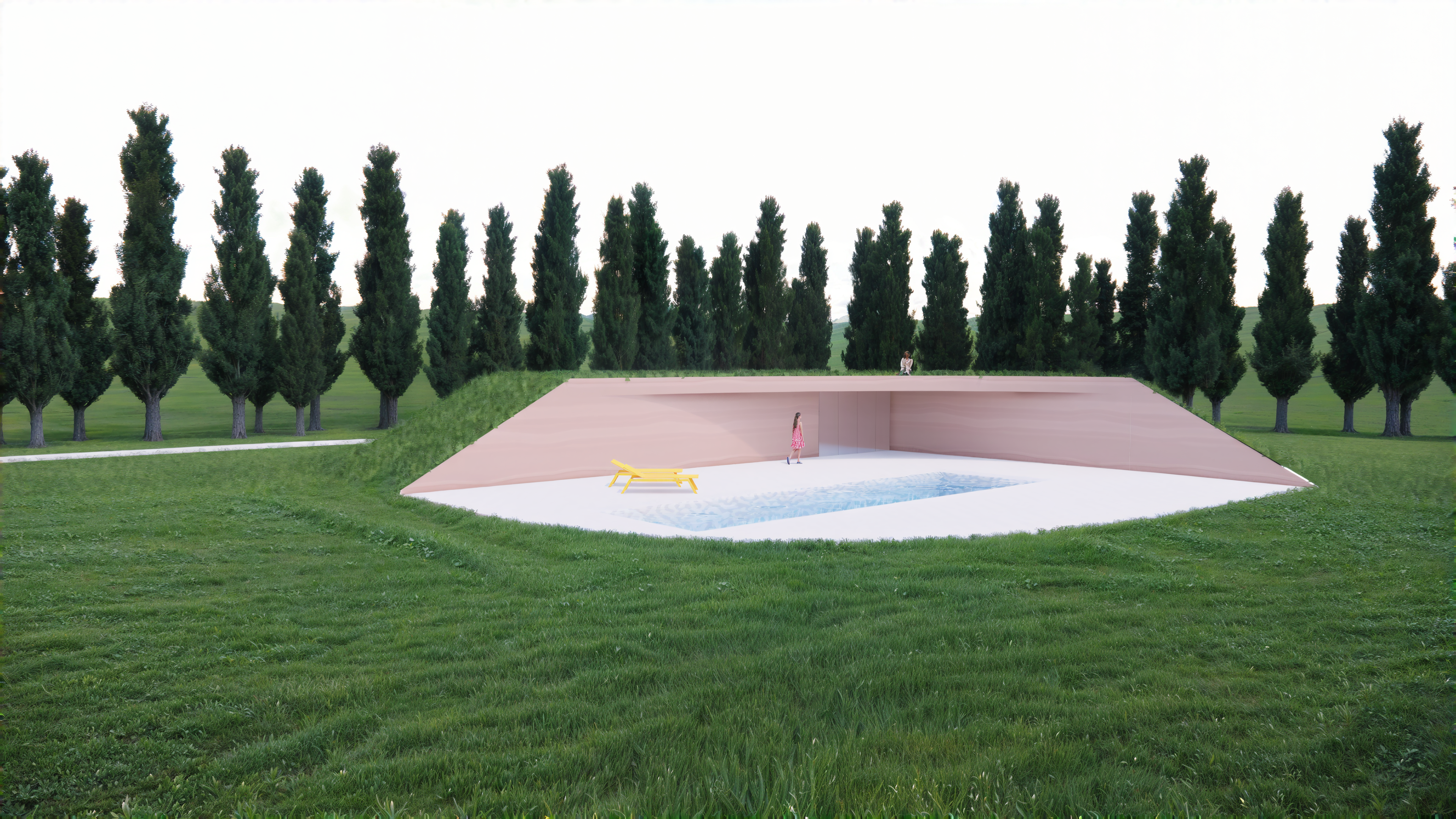 Located in a beautiful flatland setting in the outskirts of Rotterdam this pool hill and garage is invisible from 1 side, and offers plenty of privacy and views on the other side. When you approach the pool hill from the house, where the entry of the garden is located, it appears to be only a hill with some grass and flowers on it. Once passed the hill, coming closer to the pool you experience a private contrasting hardscape embedded in the natural surrounding. Inside the poolhill there is a storage for landscape machines and a sauna with showers.